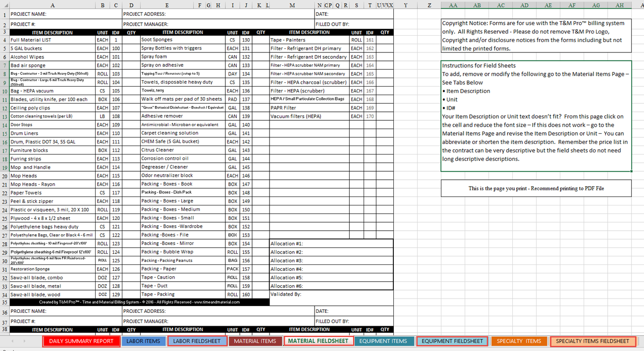 T&M Pro - All Versions now allow user to create Field Sheets directly from the program