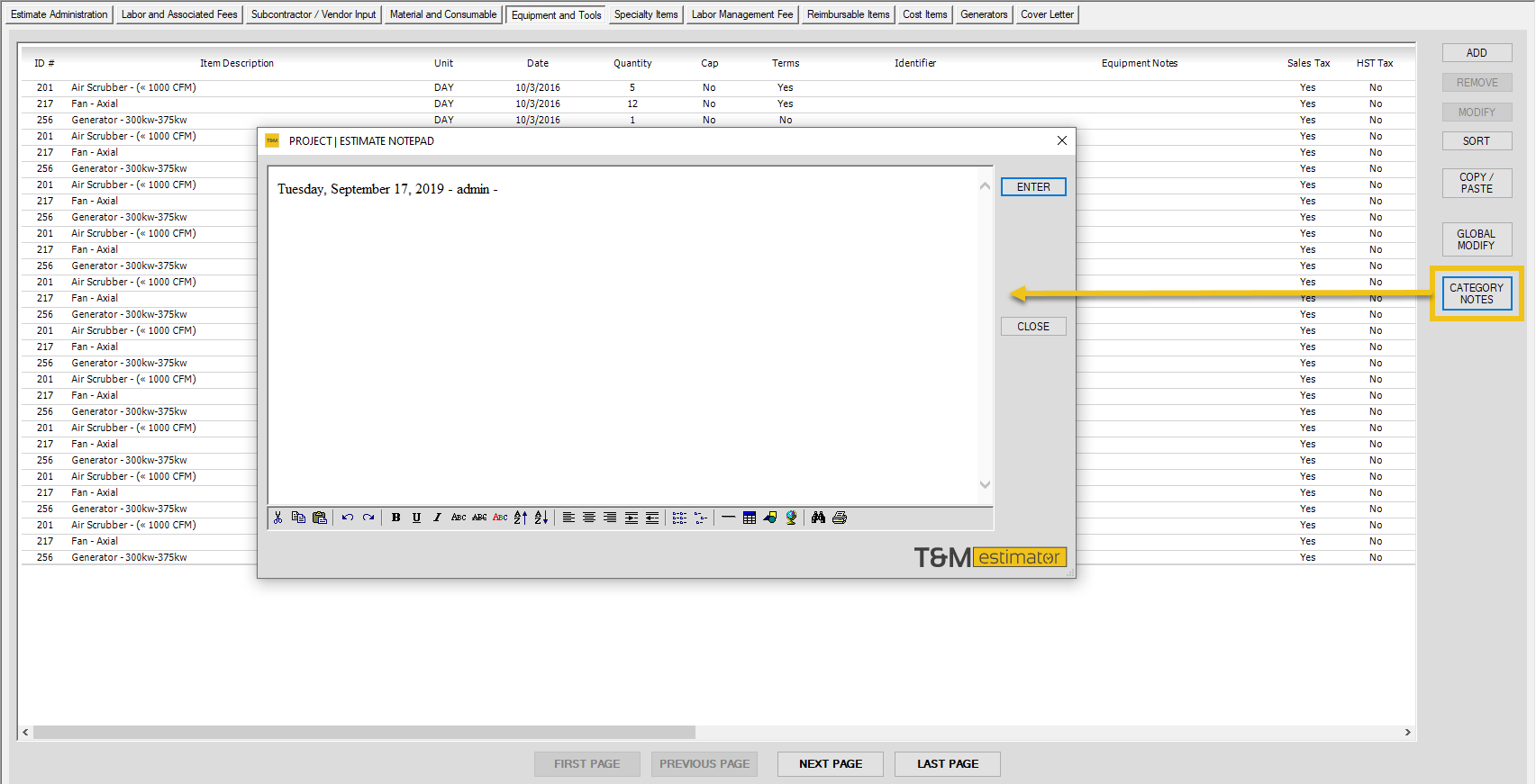 - Add Equipment Note - User can add a note for this input -