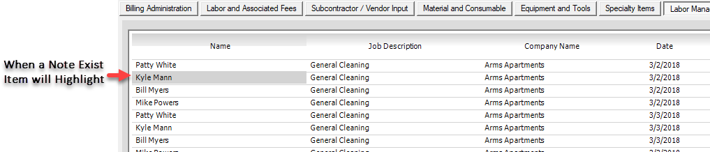 To Modify or Read an Existing Note - Click On Labor Item and Click Modify then Click on Edit Note on Dialog