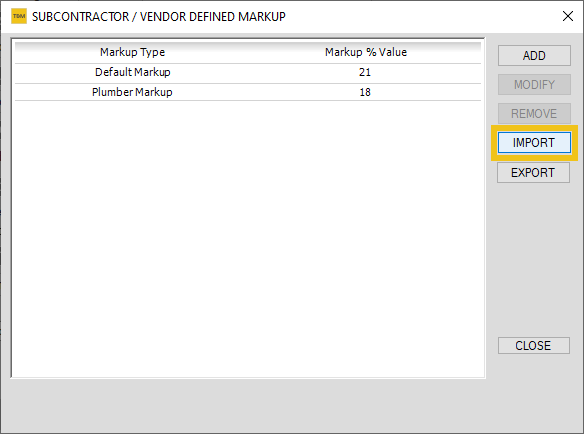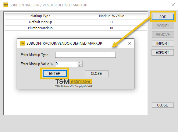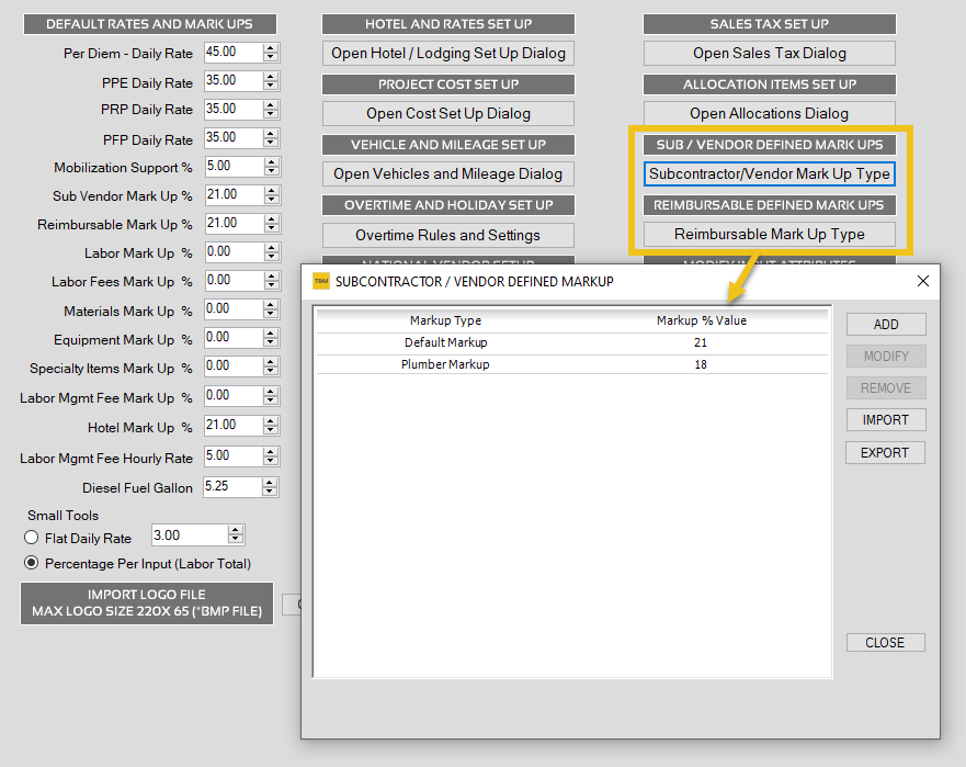 Project Settings - Subcontractor / Vendor Mark Up Total THE PROCESS IS THE EXACT SAME FOR BOTH SUBCONTRACTOR AND REIMBURSABLE Adding Additional Mark Up To List Open Mark Up Table - Click On the ADD button to open Input Dialog (see image below) Fill ...