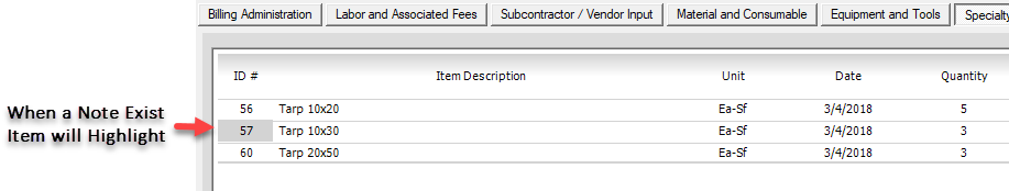 To Modify or Read an Existing Note - Click On Labor Item and Click Modify then Click on Edit Note on Dialog